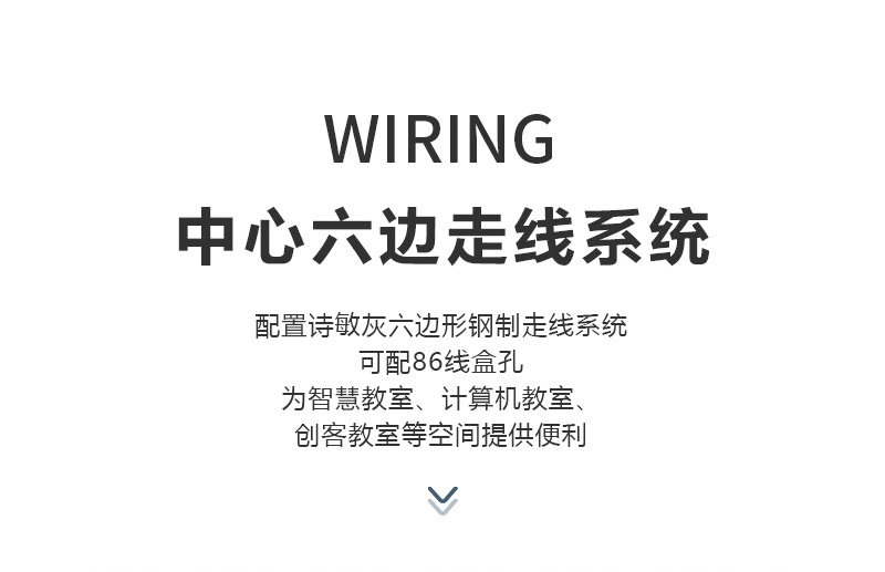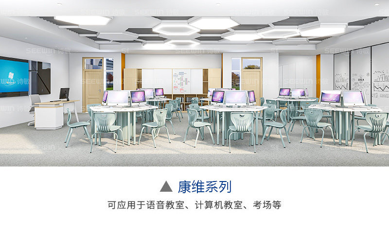 產品桌面采用E0 級MFC 板,環保安全,桌面配置插線孔,方便收納。優質鋼架烤漆支架,穩定耐用,可組合拼接,可搭配22寸以下電腦顯示屏使用,適合計算機教室使用。