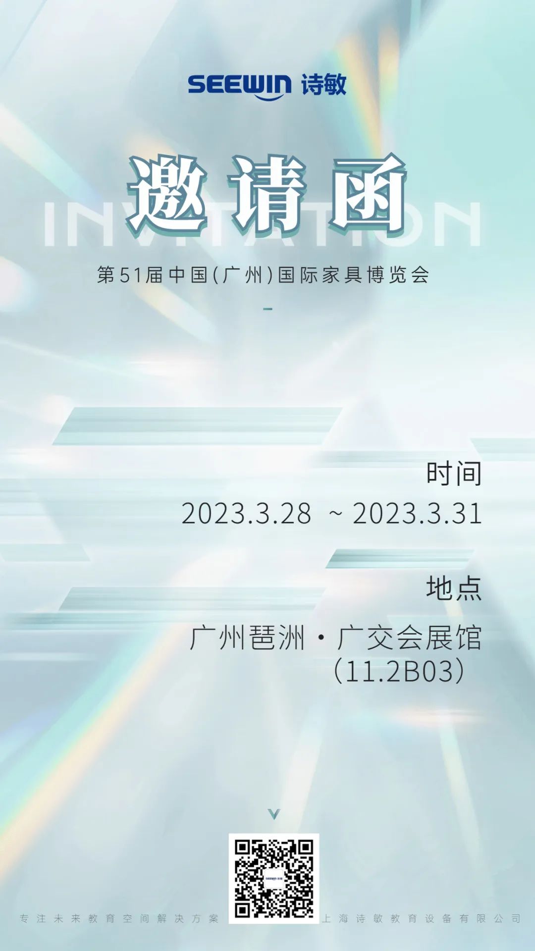 2019下半年以來,SEEWIN詩敏在上海、青島、重慶等地陸續參展,以優質創新的學校家具產品和創意獨到的學校教育空間規劃,在學校家具及教育裝備行業都引起了不俗的反響。2023年,SEEWIN詩敏還將繼續參加4月重慶高教展、南昌教育裝備展等,敬請期待。