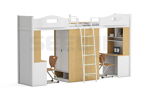 產品采用 E0 級 MFC 板,搭配詩敏專利床框架。床下配置獨立式收納空間。給學生更多的私人空間。邊緣全圓角處理,精心呵護孩子健康安全。