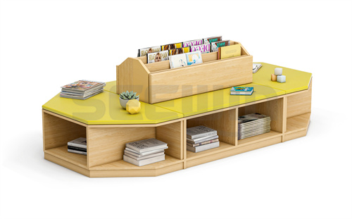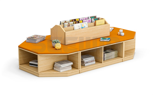 產品采用 E0 級 MFC 板與軟包結合,綠色環保。整體多變形設計,創意造型,加強學生閱讀興趣??勘耻洶问剑m合圖書館等區域使用。